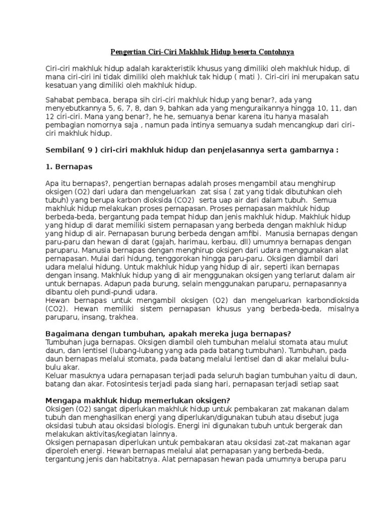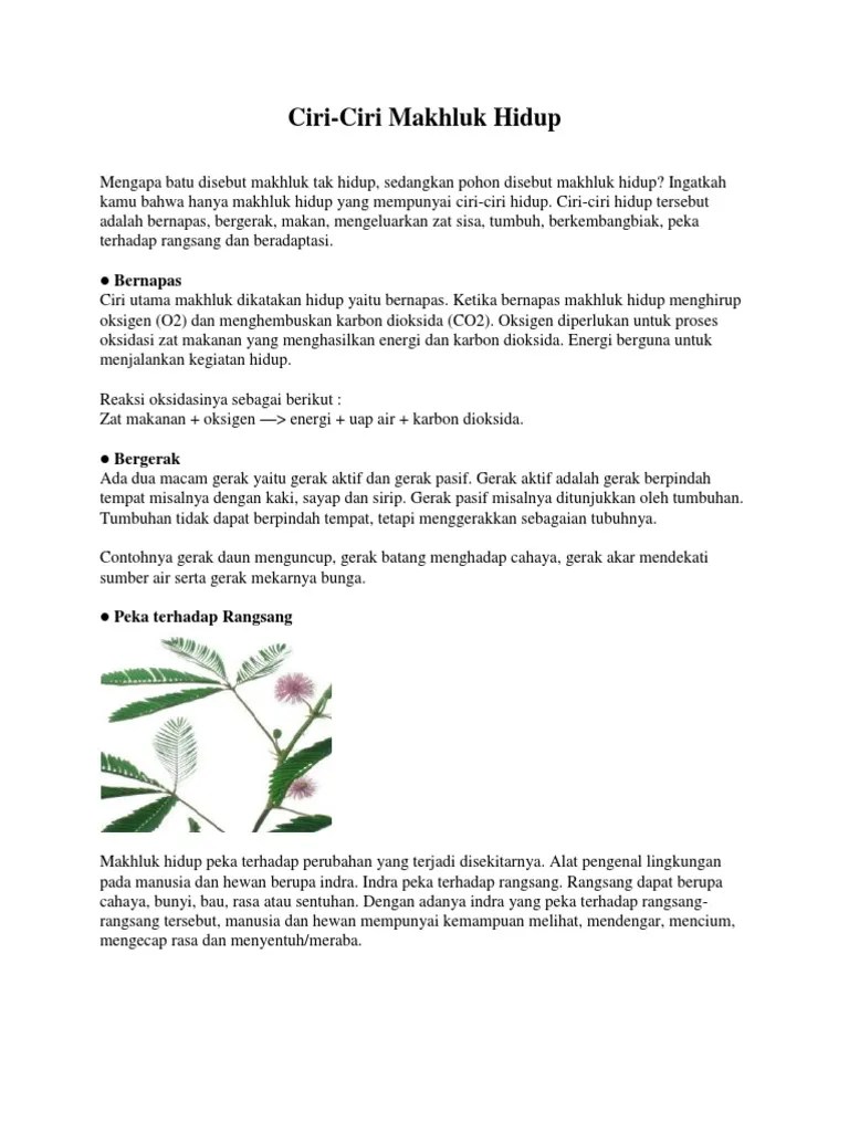 Metabolisme merupakan keseluruhan reaksi kimia yang berlangsung di dalam . Ciri ciri makhluk hidup bernafas. Contohnya adalah daun kaktus berupa duri. Bergerak merupakan ciri makhluk hidup yang membedakan dengan benda mati. Semua makhluk hidup memerlukan makanan.
